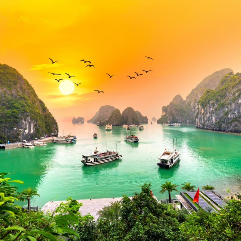 Dreamy sunset landscape Halong Bay, Vietnam view from adove. This is the UNESCO World Heritage Site, a beautiful natural wonder in northern Vietnam