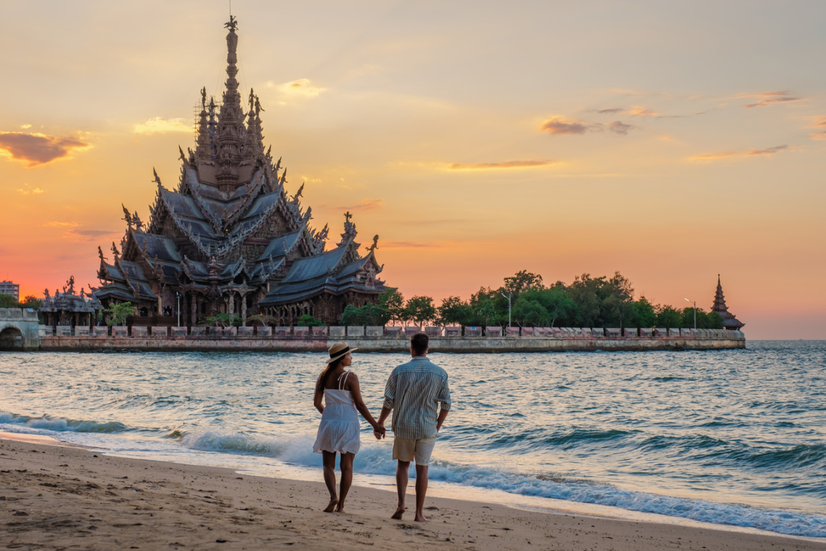 Couple walking on beach toward Pattaya's Sanctuary of Truth