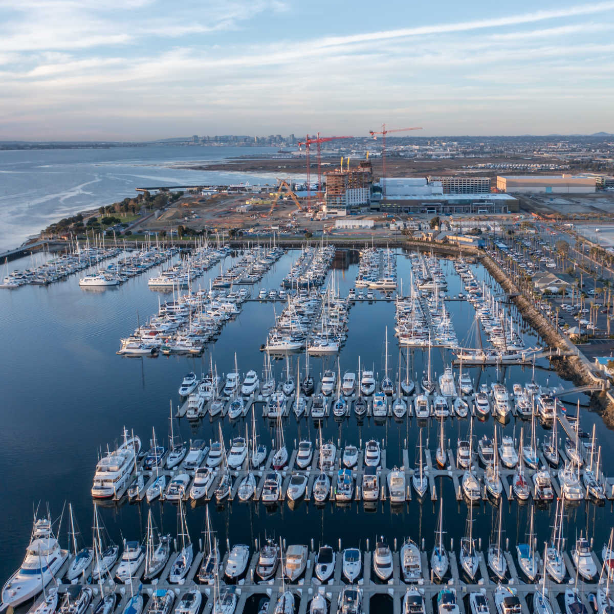 Aerial view of Chula Vista Marina with downtown San Diego skyline as backdrop