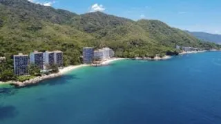 Scuba divers underwater and tour boat above the Caribbean Sea in Cozumel
