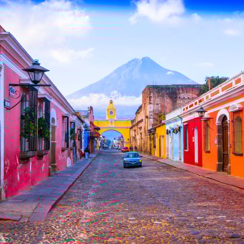 colorful houses and archway in a cobbled street in antigua guatemala with mountain in the background