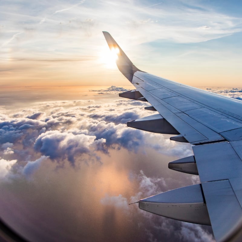 view of pretty clouds over the ocean from a plane window at sunset